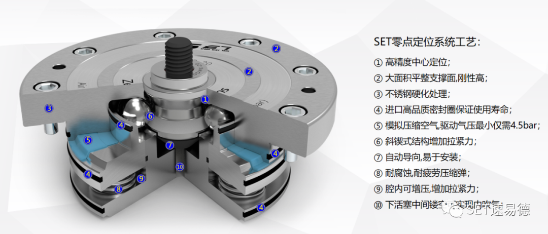 ميزة أخرى لنظام نقطة الصفر هي وظيفتها المزدوجة: يتم تنفيذ تحديد المواقع والتشبث في وقت واحد ، مع دقة أقل من 5 μs. يجعل دبوس تحديد المواقع المخروطي القصير سطح التلامس مغلقًا تمامًا وله وظيفة قفل الذات. يتيح التثبيت الموضعية انحرافًا شعاعيًا وانحرافًا زاويًا معينًا ، والذي يتمتع بمزايا معينة للتحميل والتفريغ التلقائي أو اليدوي.