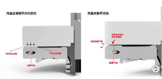 من أجل ضمان استقرار الدرج وتلبية متطلبات تحديد المواقع ، يجب أن يضيف موضع الموضع صفر جهاز اكتشاف التثبيت ، والغرض من هذا الجهاز هو التأكد من أنه يمكن لموضع الموضع الصفري الاتصال تمامًا بسطح تحديد المواقع للدرج ، ولن يكون هناك قطع حديدي أو حطام آخر في الوسط. يظهر مبدأ العمل في الشكل (1). سوف يطلق الهواء الكشف ضغط الهواء (0.2mpa) من الهواء خارج الفتحة. اضبط قيمة تصنيف مستشعر التدفق. عندما لا تكون الدرج مسطحًا مع الموضع ، كما هو مبين في الشكل 2 ، فإن الغاز الذي تم اكتشافه يهرب إلى الخارج على طول الفجوة ، وسيحدد مستشعر التدفق فرق التدفق ، وذلك لتحقيق اكتشاف التثبيت. سوف يرش ثقب الكشف أيضًا ضغط تنظيف 0.6mpa إلى الخارج لضمان تنظيف Stoma. يمكن اكتشاف مواقع متعددة في وقت واحد ، وبالتالي تقليل التكاليف ؛ 2. بمجرد وجود قيمة تدفق تسرب في العديد من المواقف ، سيكون غير متسق مع قيمة تدفق الإعداد المسبق ، لذلك يكون أكثر أمانًا ؛ 3. طريقة الكشف أكثر مباشرة ، لا يتم تحميل الدرج ، ويمكن اكتشاف مقطع الموضع الفارغ.